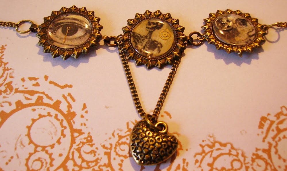 It features three antiqued brass cabochons inside which are contained three aged images of an eye, a skull and a skeleton. Adorning the images are a vintage watch hand, vintage gear or cog, and a vintage press stud. The chain measures approx 18 inches and can be shortened or lengthened as you prefer. Available on Etsy at http://www.etsy.com/listing/54199313/in-my-minds-eye-skeleton-skull-and-watch